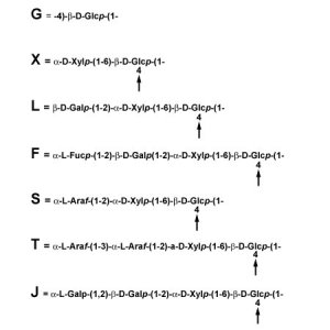 Los oligosacáridos del xiloglucano se nombran según la nomenclatura propuesta por (Fry et al., 1993): cada glucosa se representa por una letra que indica el tipo de cadena lateral que lleva unida, y se empieza siempre por el extremo no reductor.