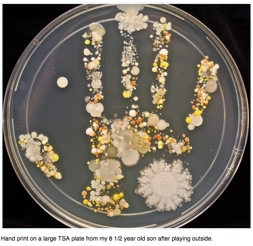 Todos hemos visto esas imágenes de los microorganismos que hay en las manos de un niño. En un experimento muy clásico, algo que todos hemos hecho para «enseñar» que hay bacterias, a un niño pequeño se le pone una mano sin lavar en una placa de cultivo, se le pide que la lave, y se repite. El resultado es asombroso, porque la mayor parte de las bacterias desaparecen tras el lavado de manos.